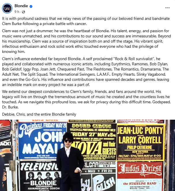 Con profunda tristeza compartimos la noticia del fallecimiento de nuestro querido amigo y compañero de banda Clem Burke, tras una batalla privada contra el cáncer.